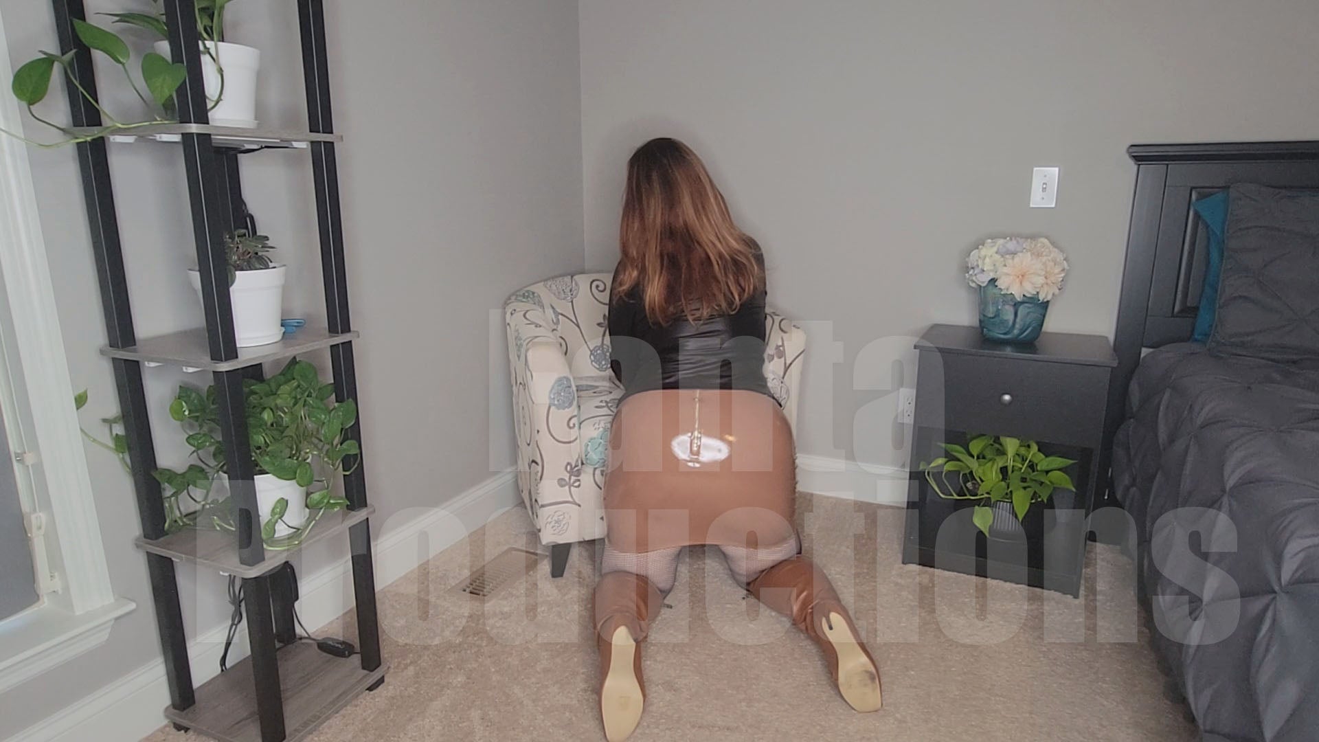 I’m wearing my sexy fishnets with a pair of caramel-colored knee-high stiletto boots. I’m also wearing a thin leather top with no bra underneath. I talk about my outfit for the first 3 minutes while I am sitting in my chair with my legs crossed (full body). The remaining 2 minutes, I get on the floor on my knees and show off the skirt and boots, turning in various directions, while still talking about my outfit.